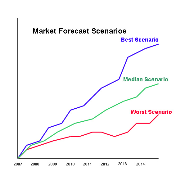 The diagram describes the method used to provide a median probability forecast. In any forecasting model there are a number of possible forecast scenarios, these are represented above as "—", "—" and "—", the median probability ( "—" ) plots a curve through the possible forecasts which represent the most probable scenario. This method of forecasting is used in all the forecasts and trends given in this report.